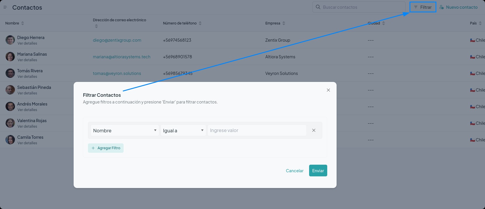 Filtrado de contactos